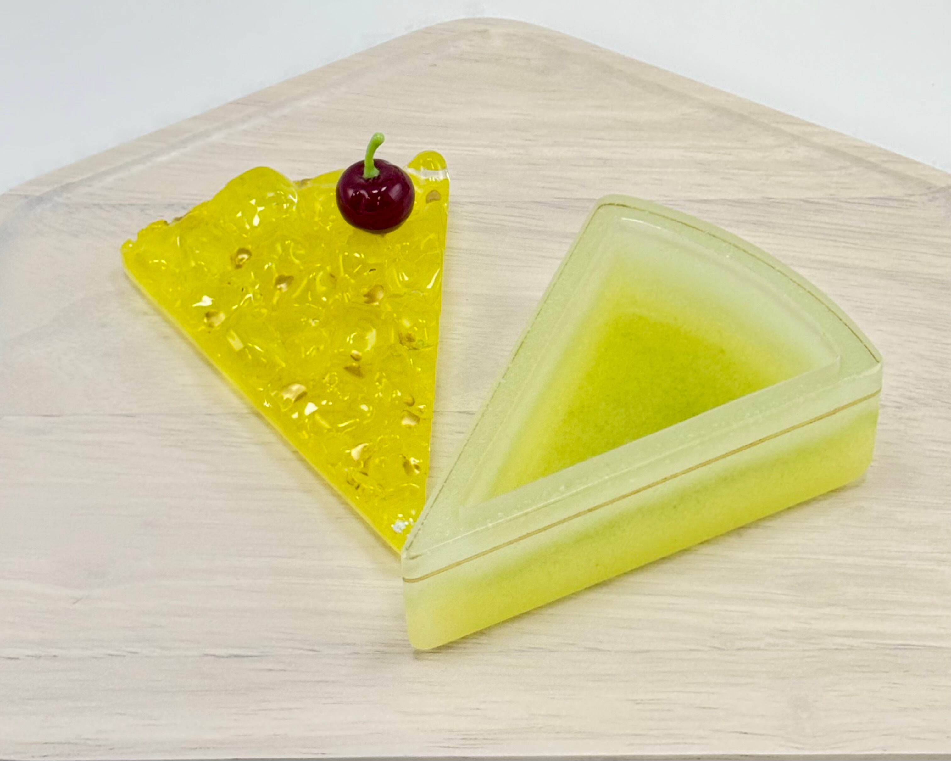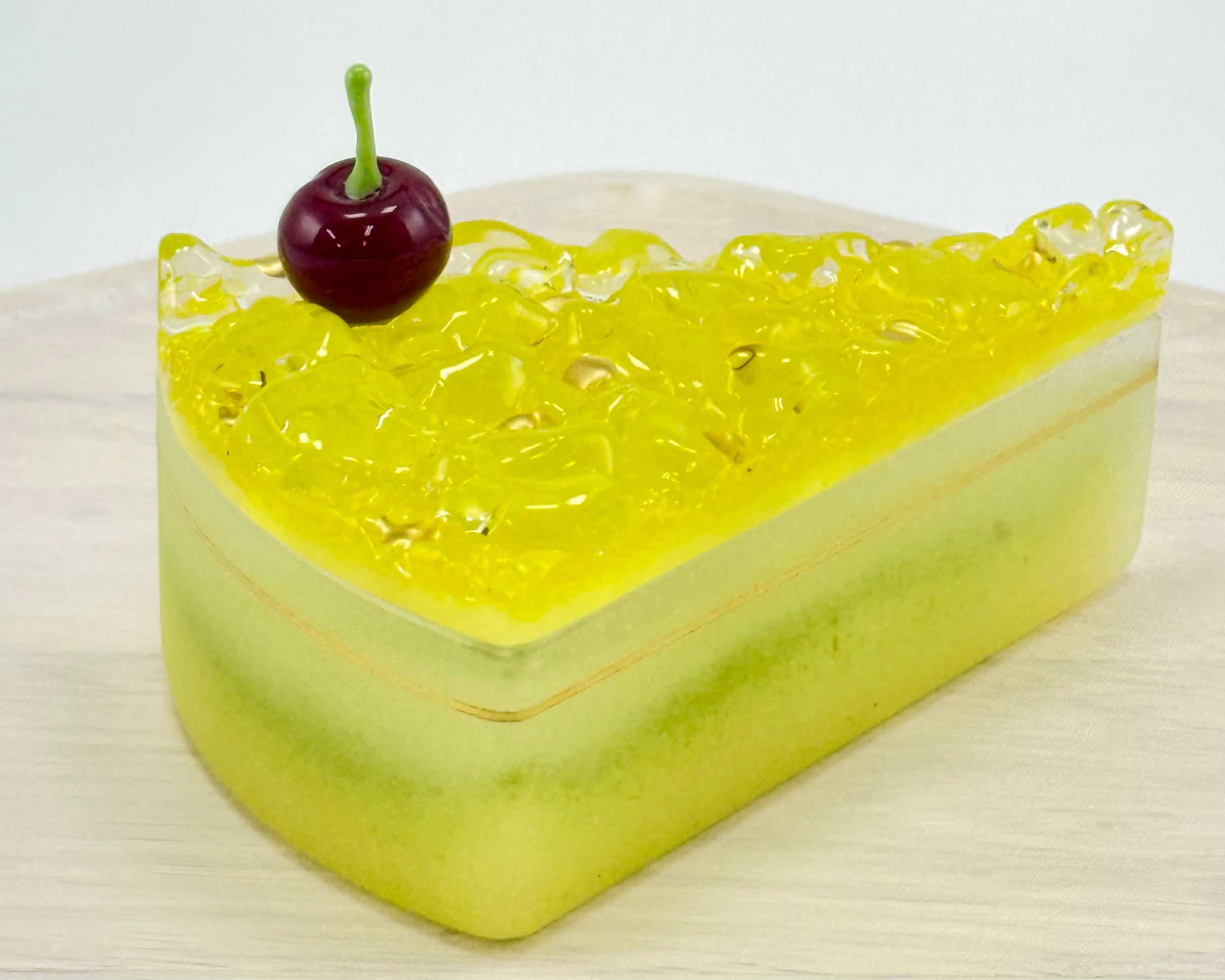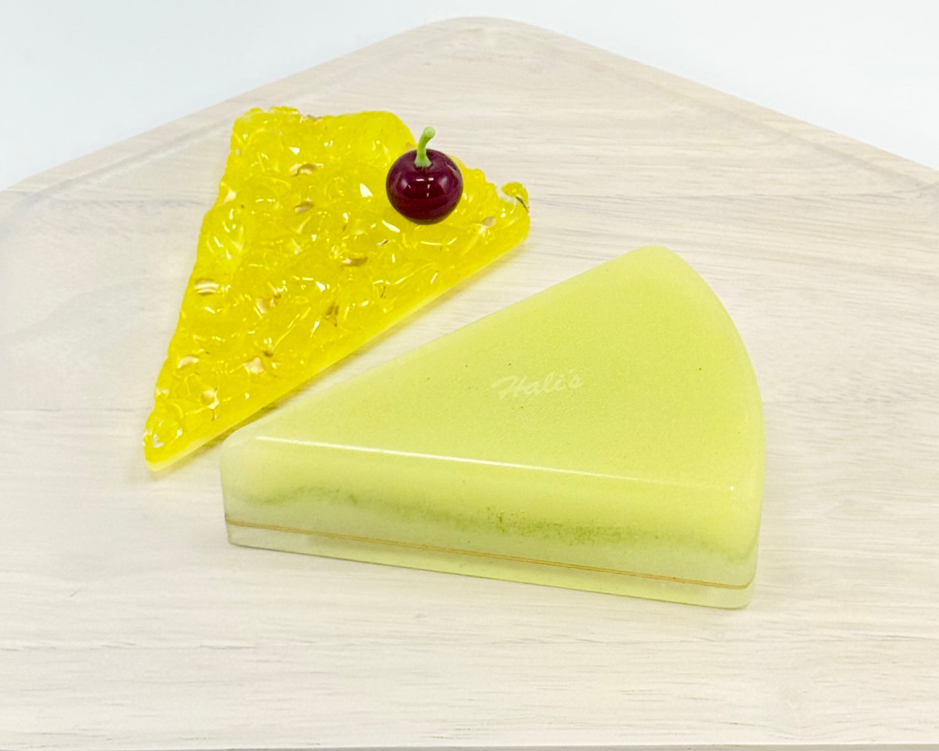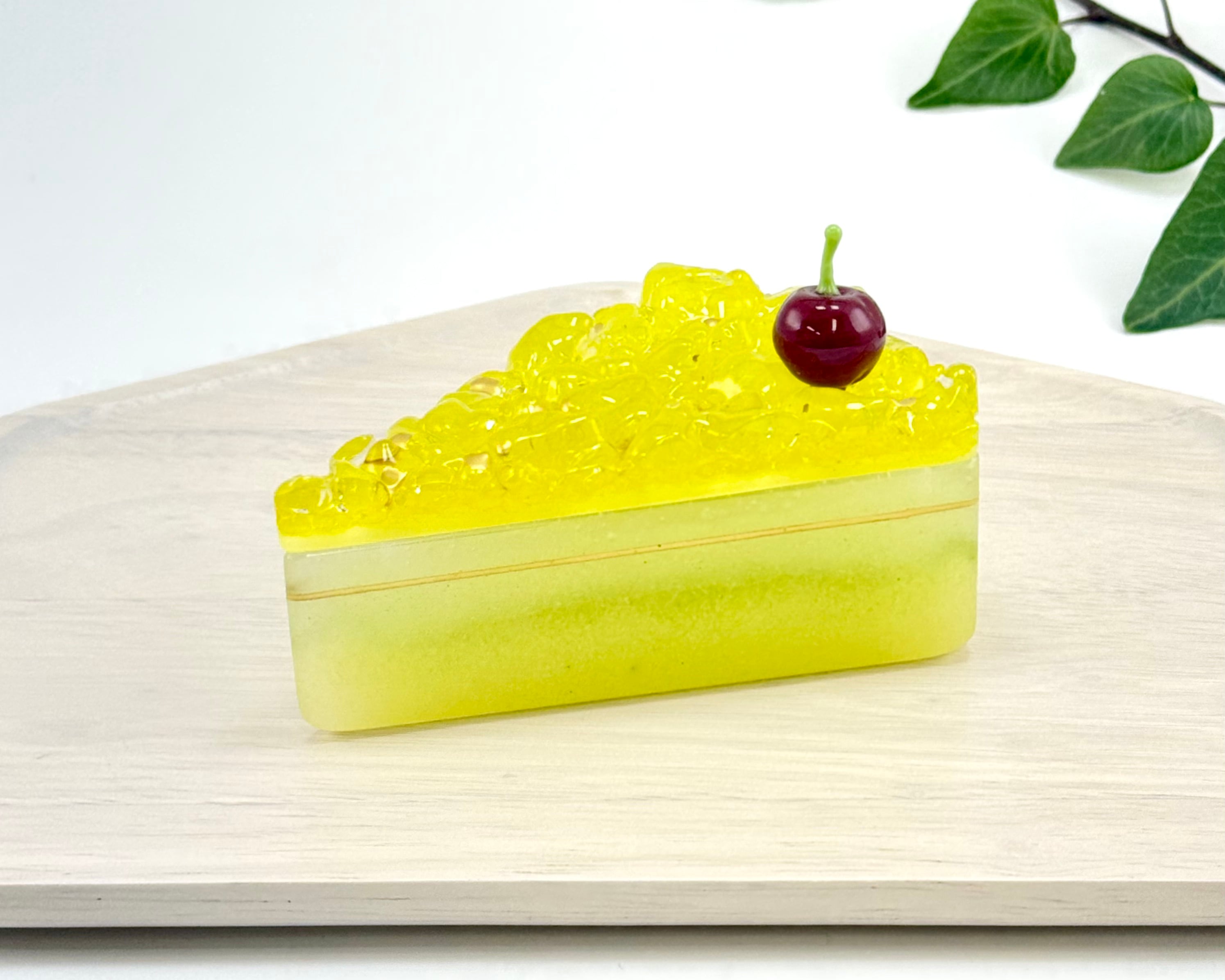 ジュレのような質感のケーキにのっているチェリーもガラスで出来ています。