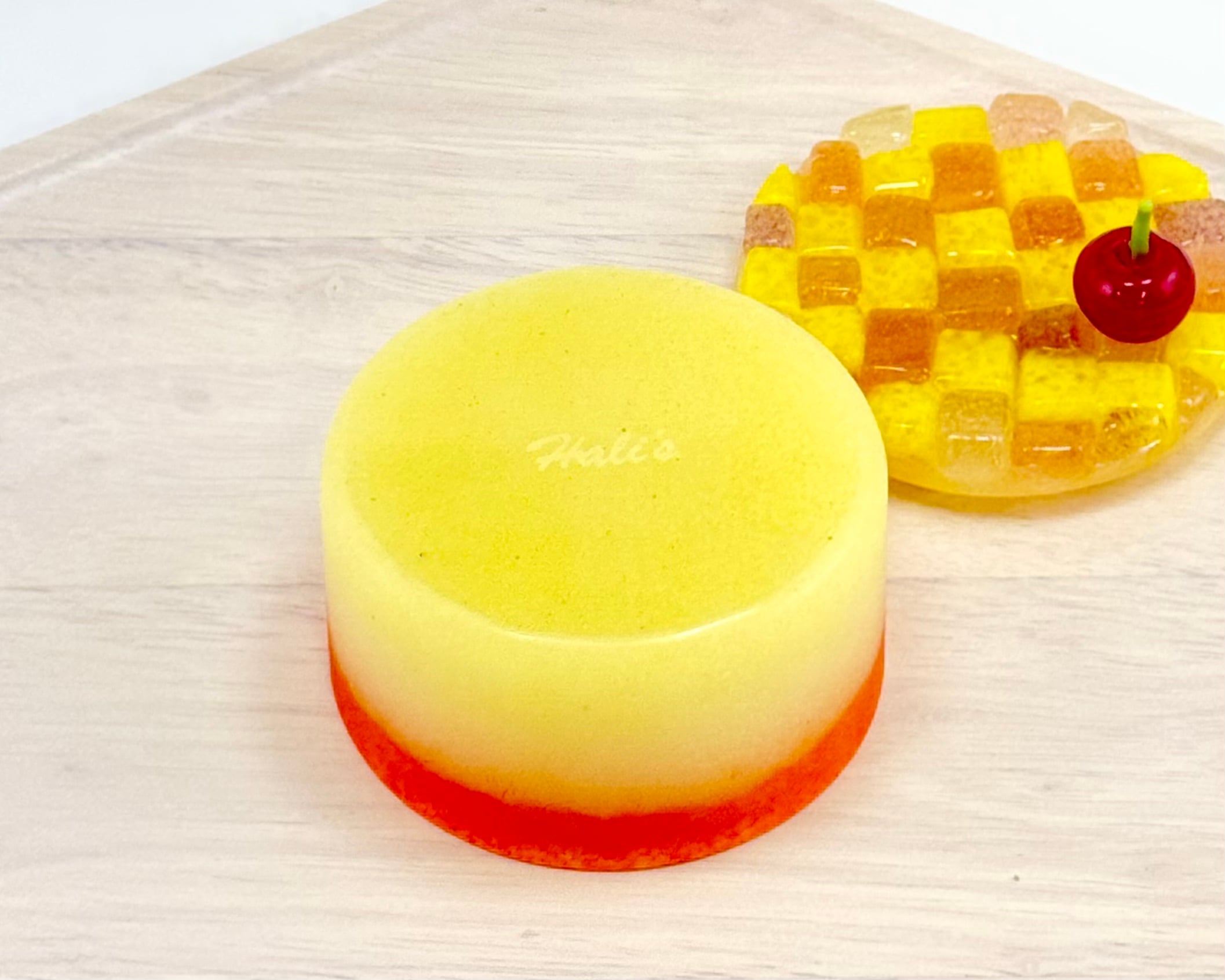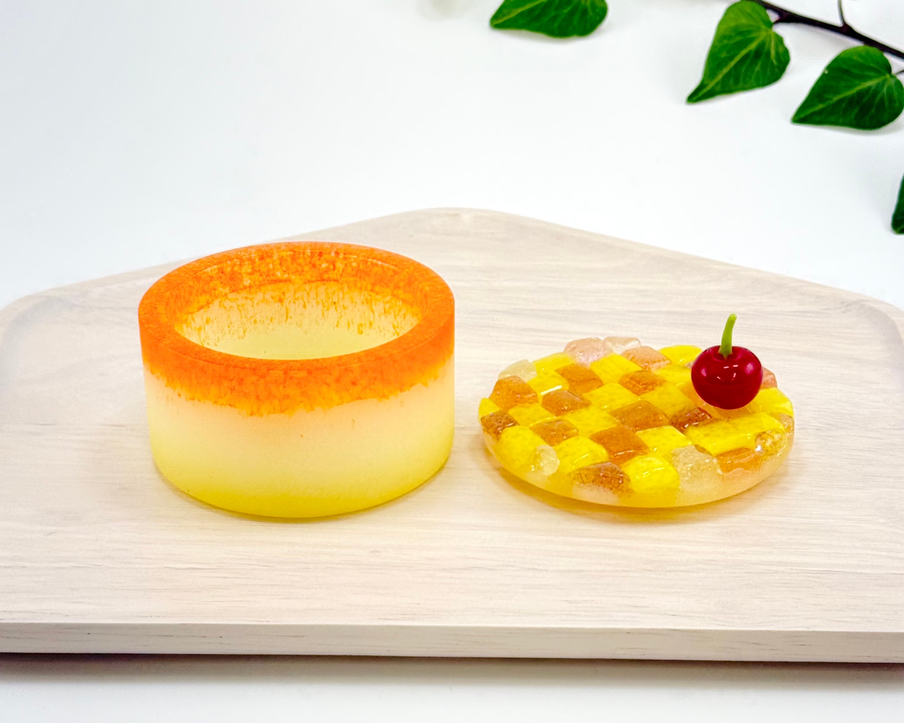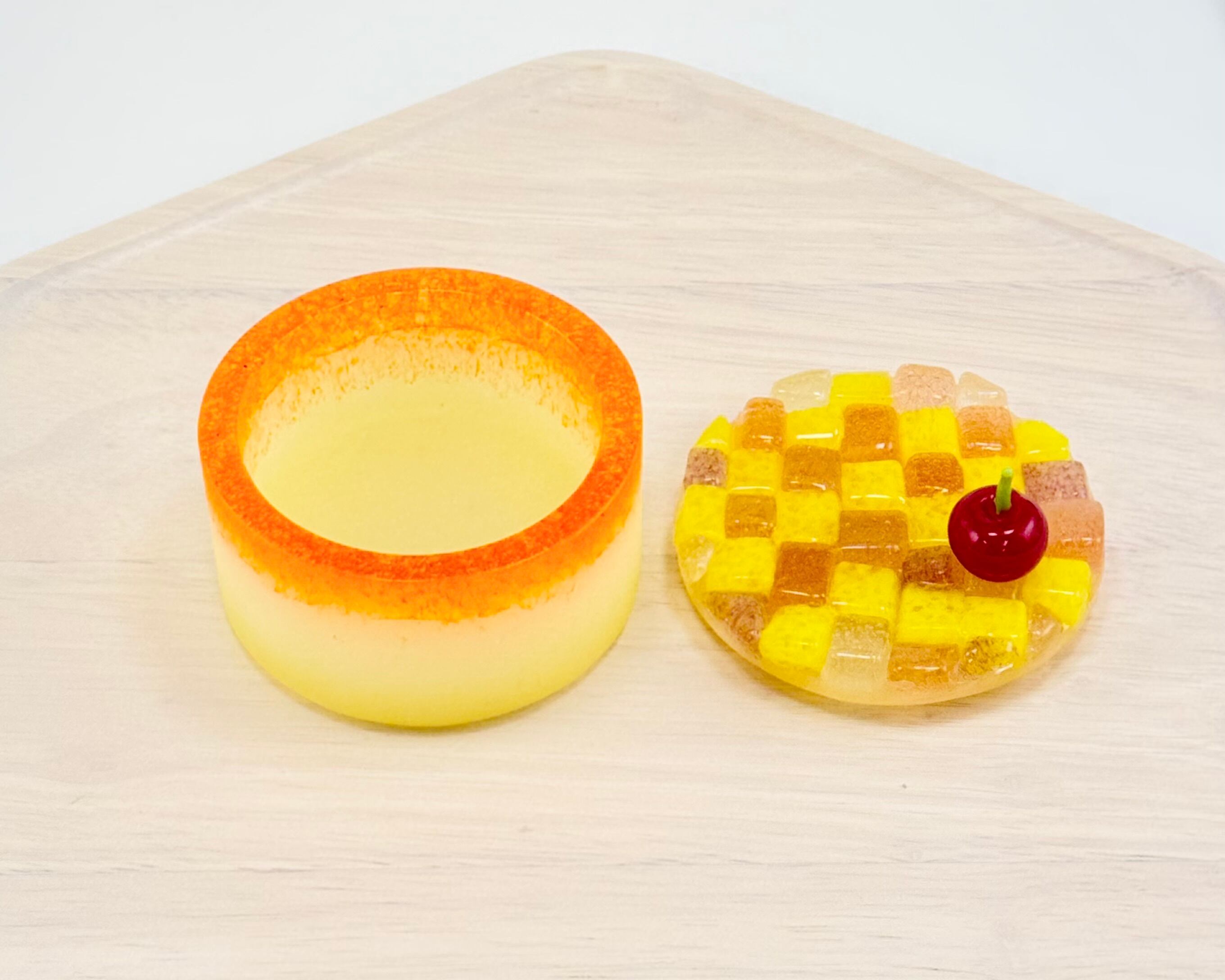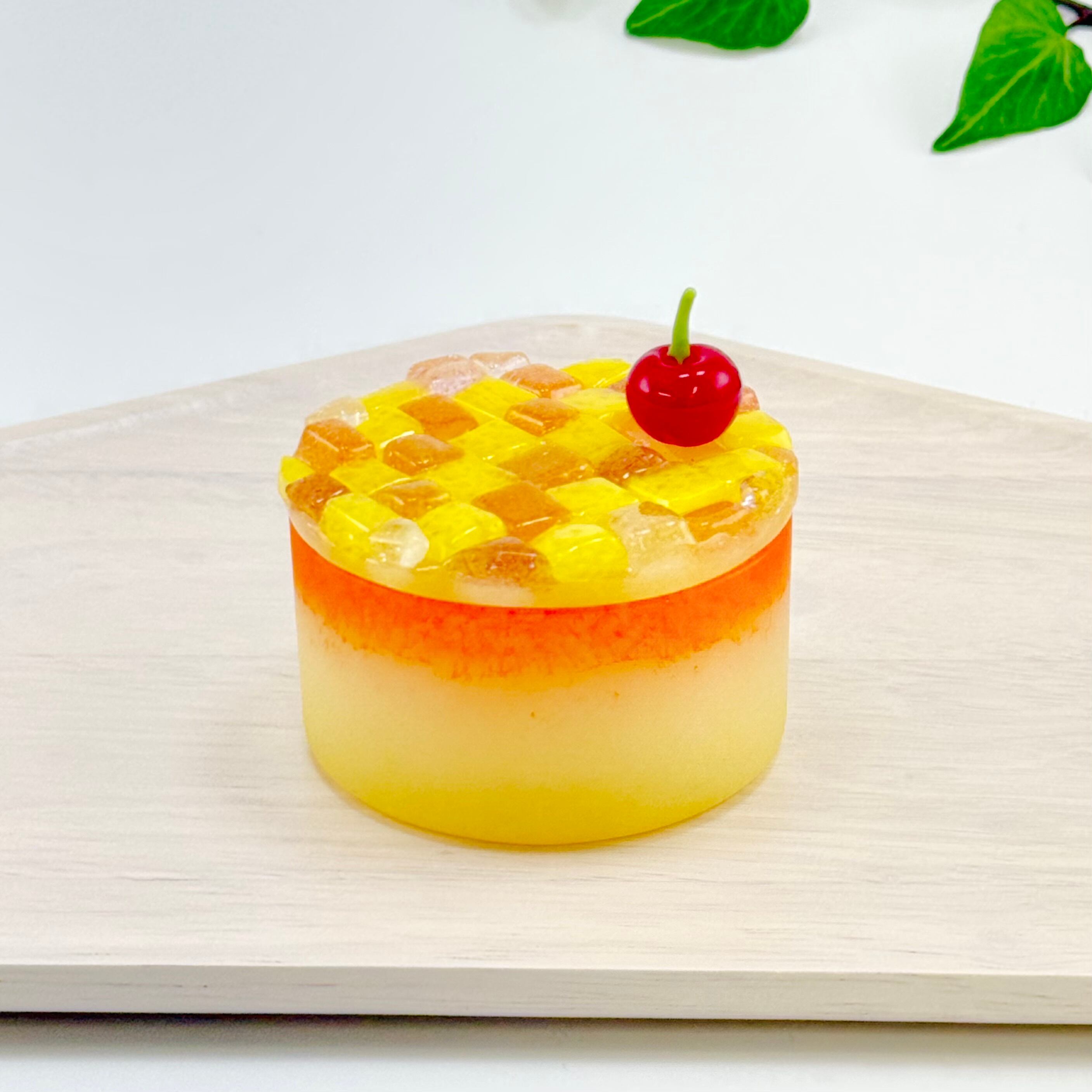 ケーキにはバーナーワーク技法で制作したさくらんぼのガラスをトッピング。