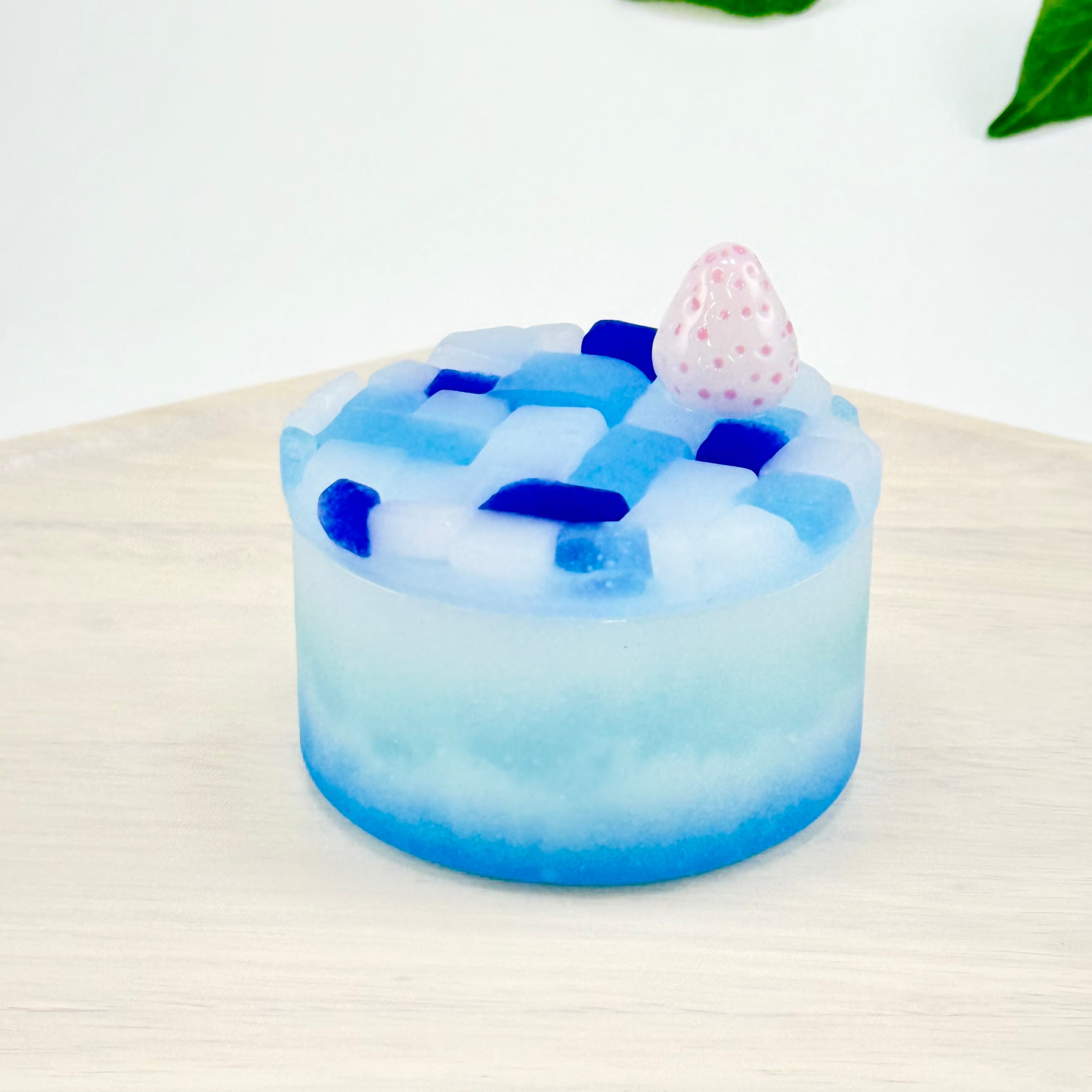 ケーキにはバーナーワーク技法で制作したホワイトストロベリーのガラスをトッピング。