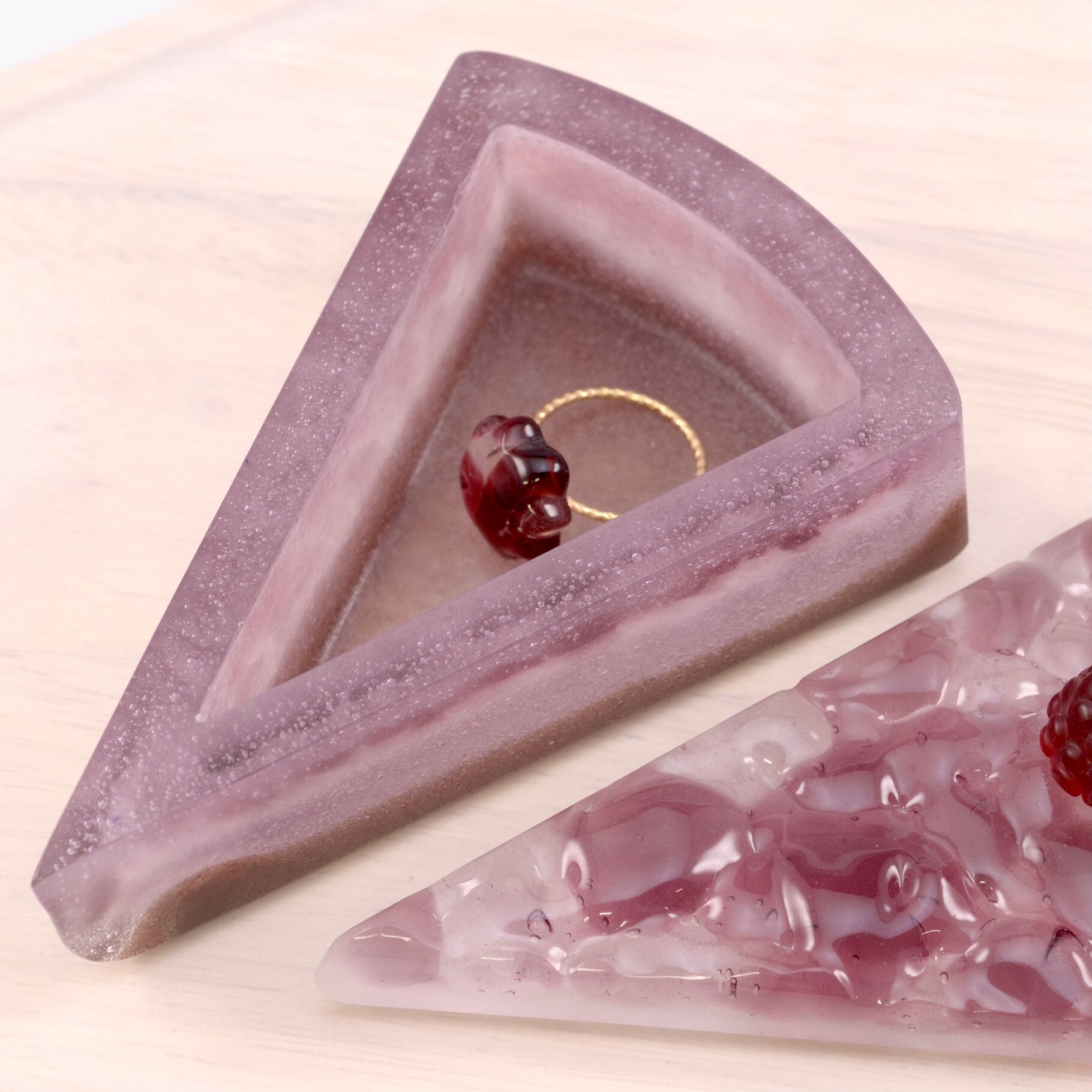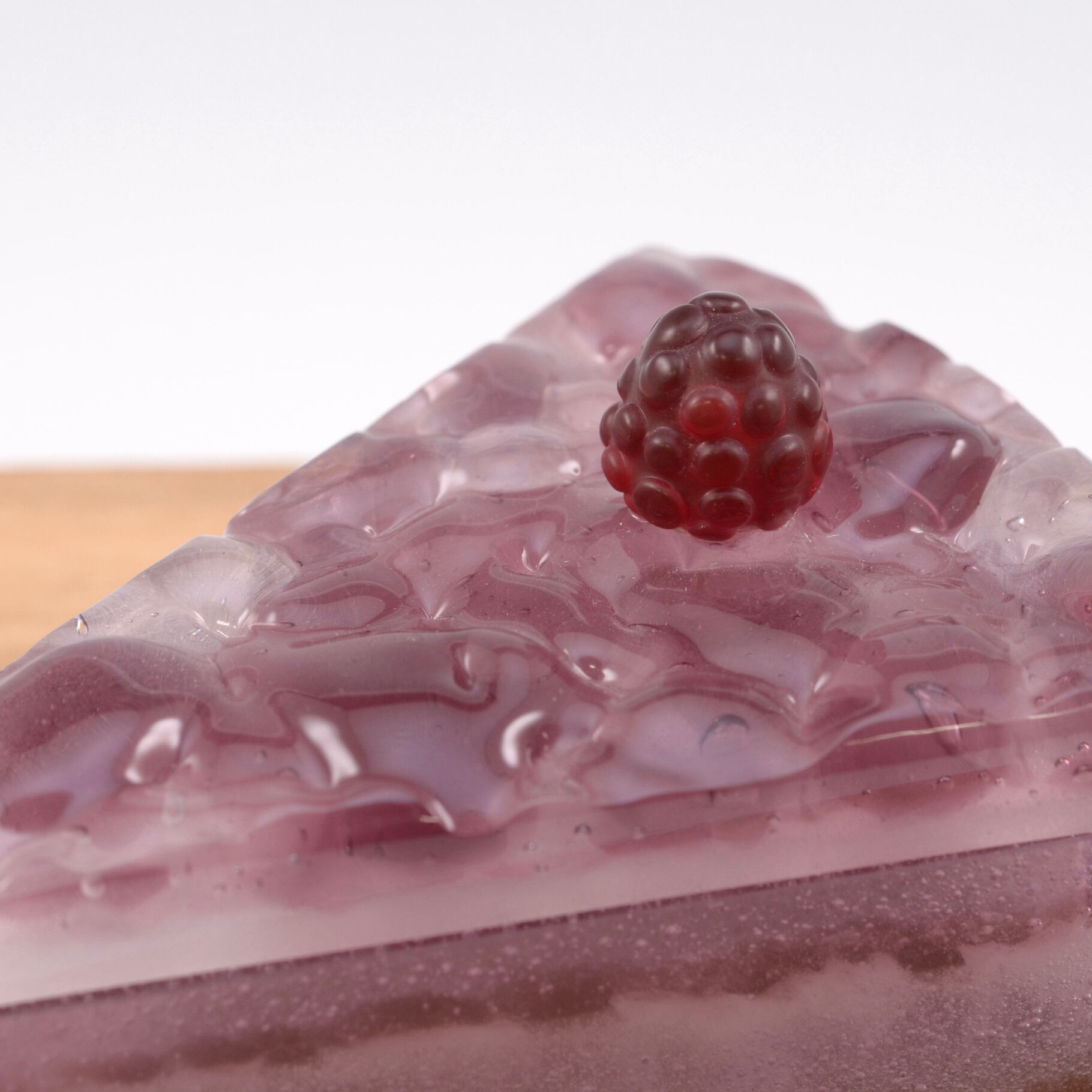 ケーキにはバーナワークで制作したラズベリーと、吹きガラス技法で制作した金箔をあしらったループパーツをトッピングしました。