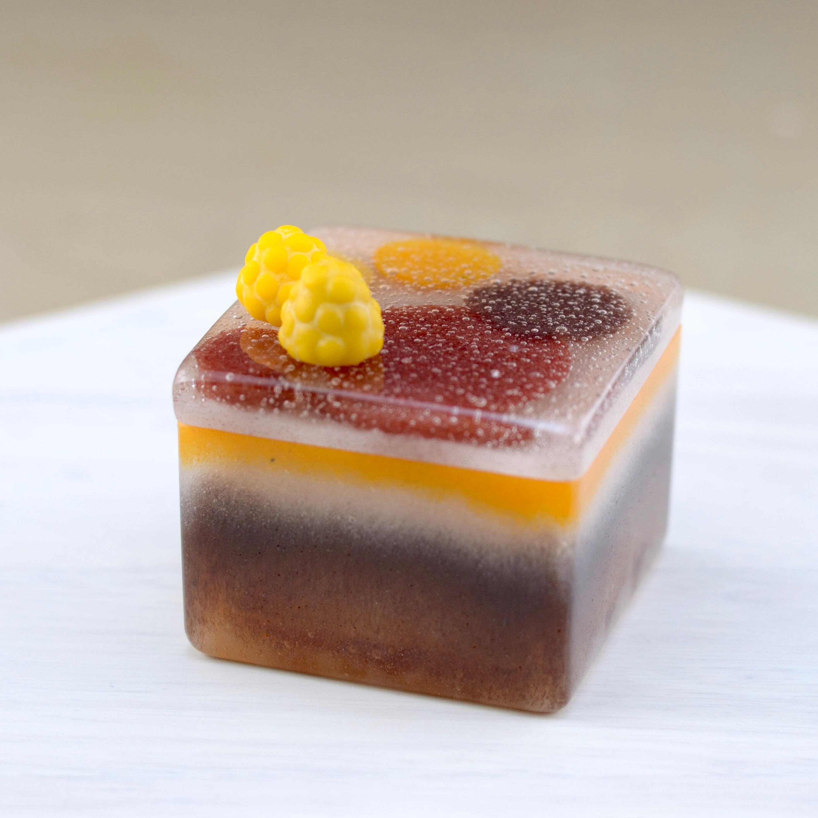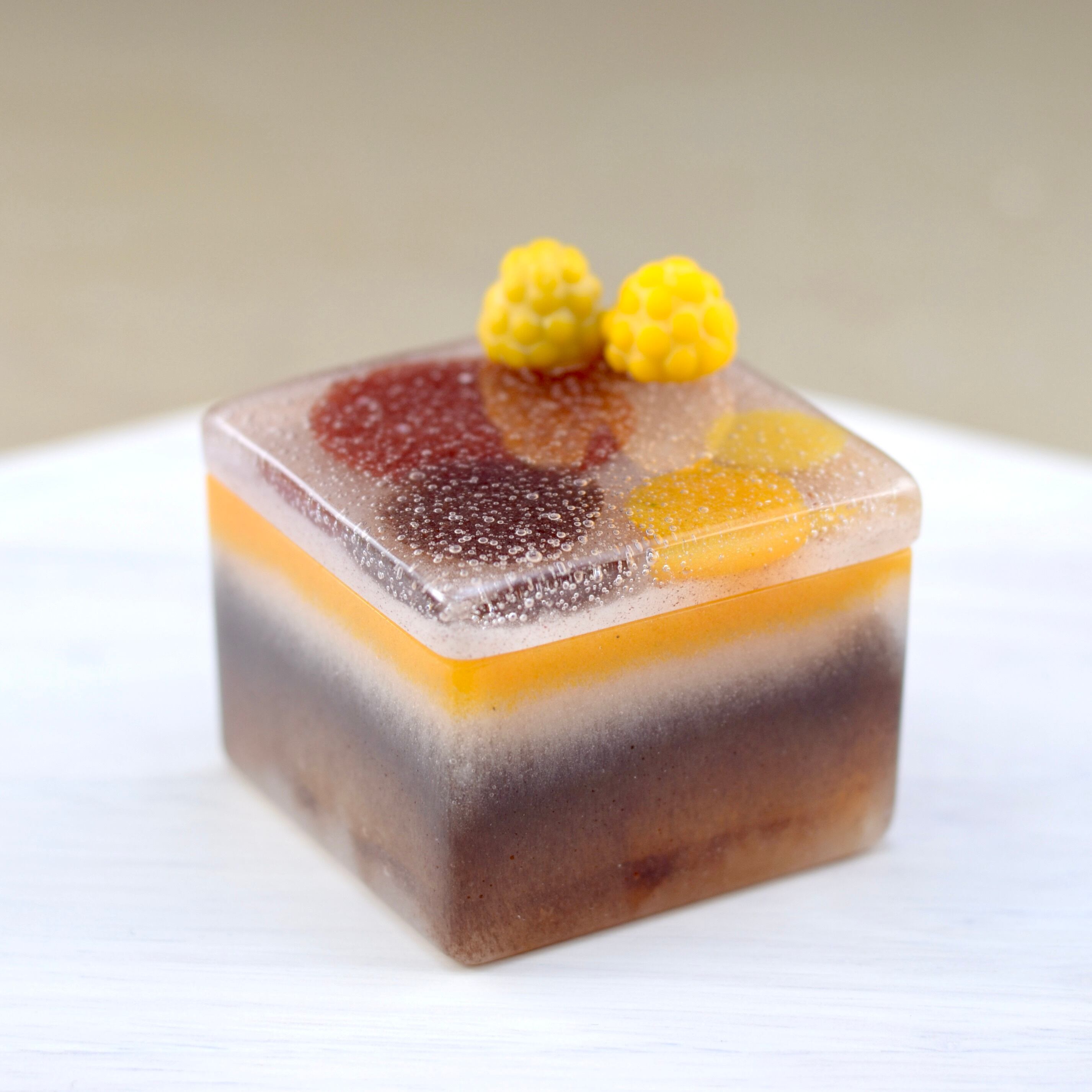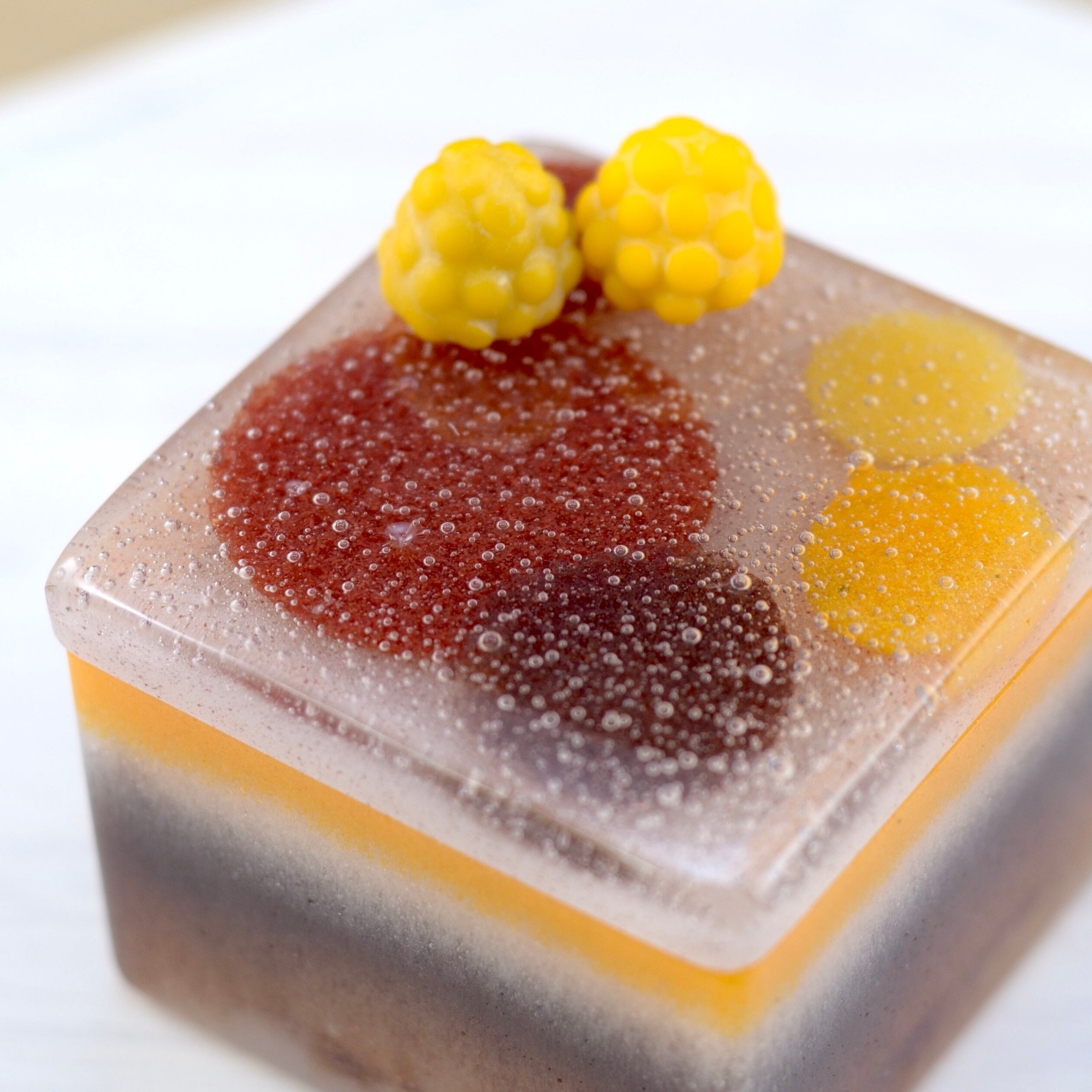 バーナーワーク技法で制作した黄色いラズベリーがケーキを彩っています。