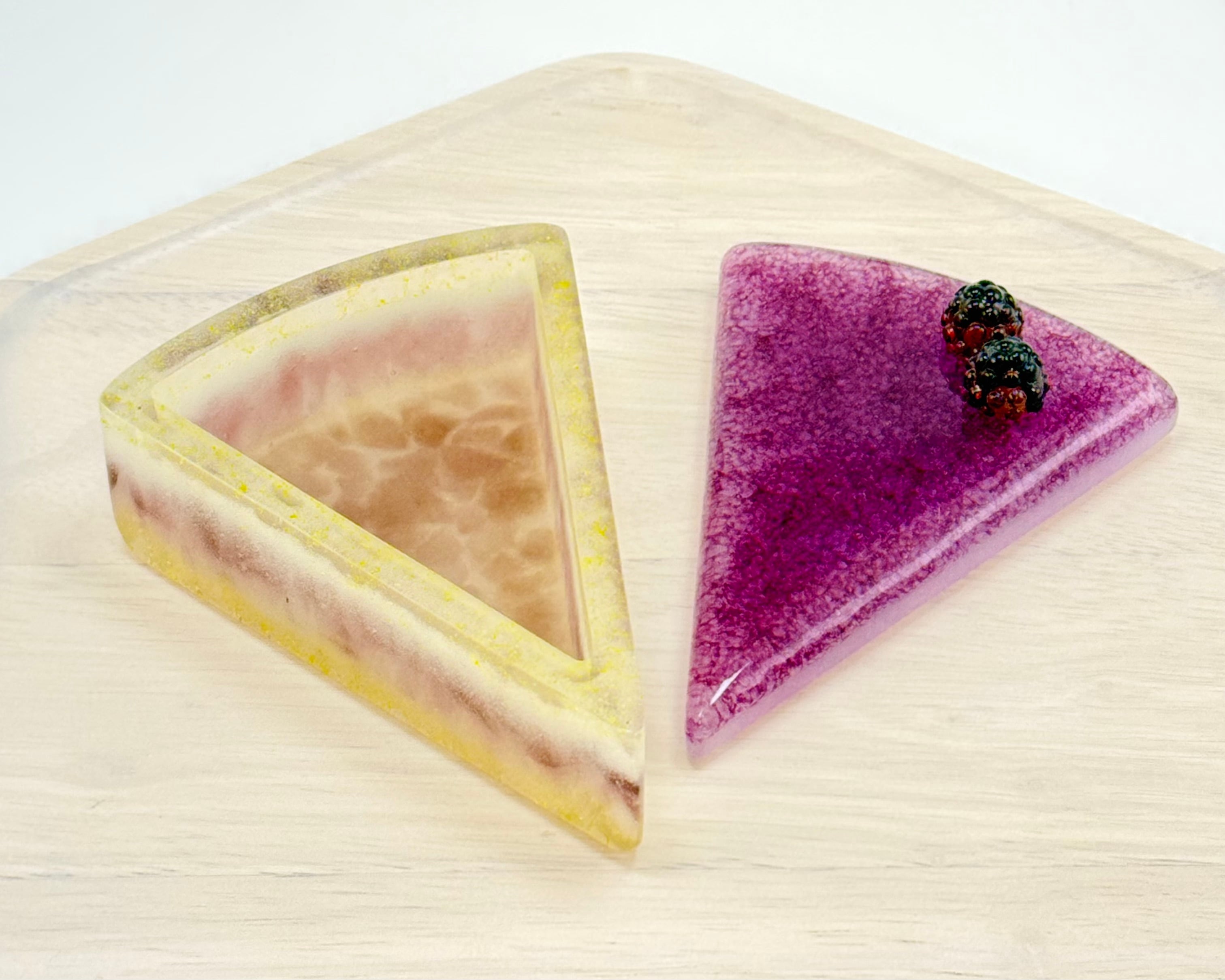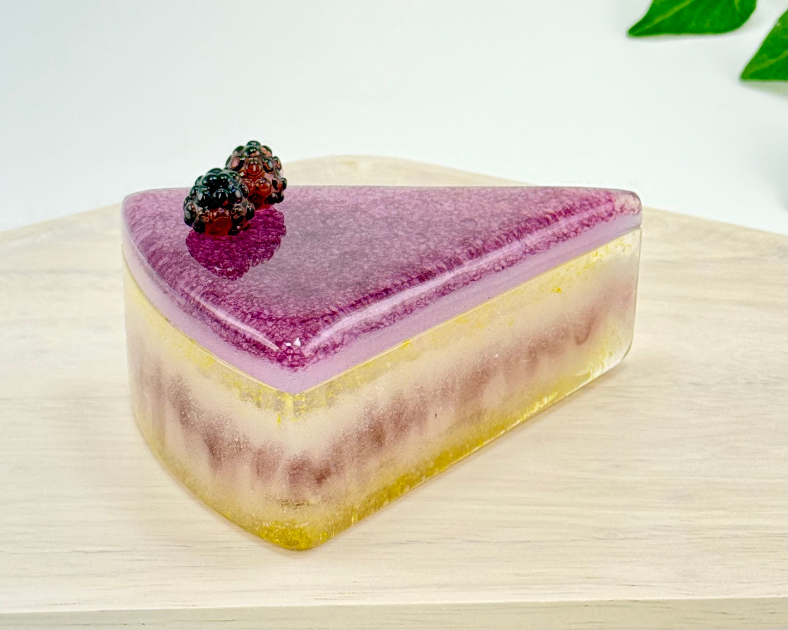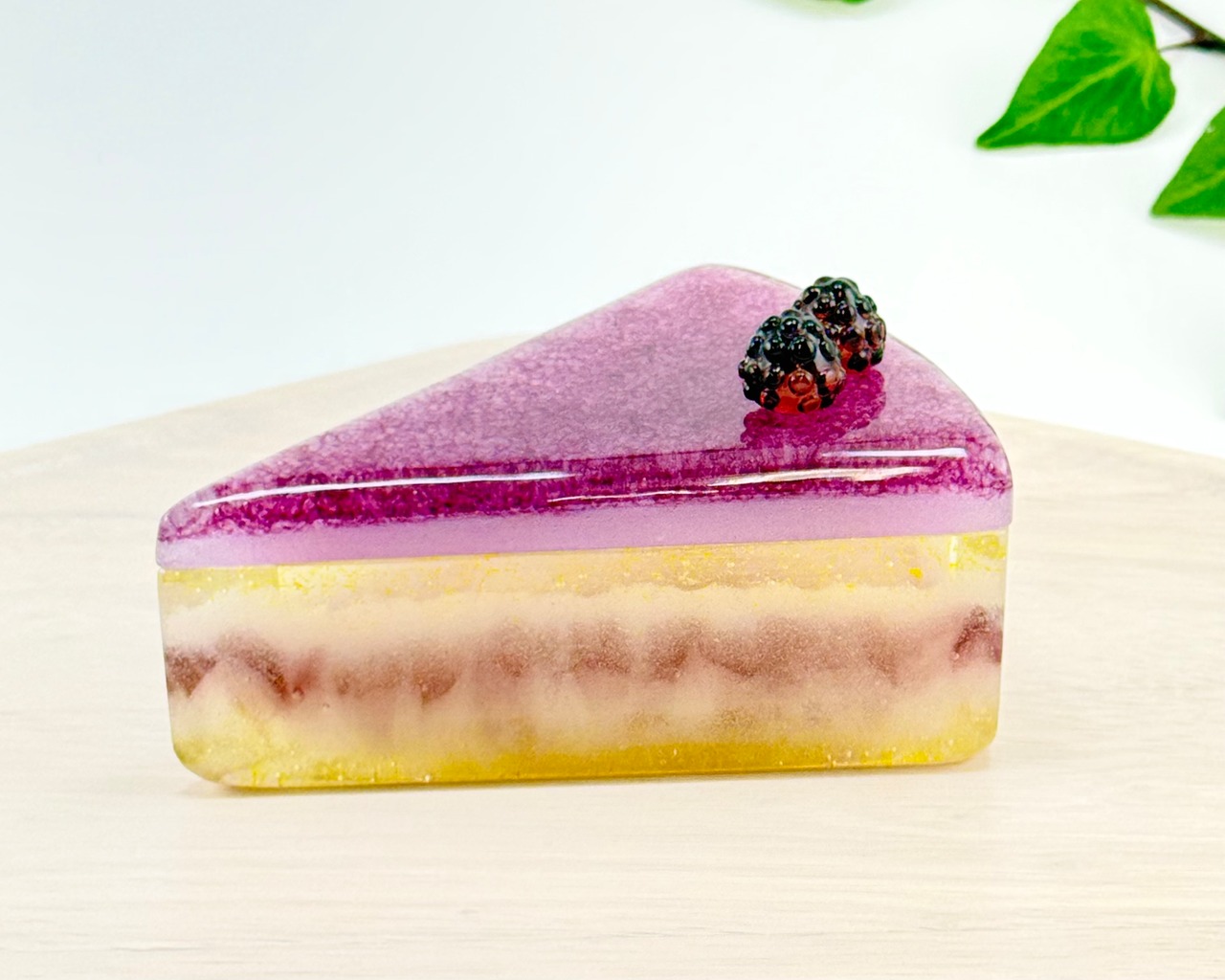 ケーキにはバーナーワーク技法で制作したベリーのガラスをトッピング。